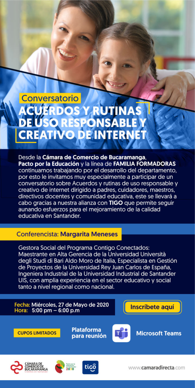 Este conservatorio profundizó las siguientes temáticas: 1) Descubre qué hacen en internet los niños y adolescentes de Colombia, 2) Hábitos saludables para acompañar el aprendizaje de los niños y adolescentes en internet, 3) Acuerdos familiares y rutinas para el uso responsable y creativo de internet y 4) Recomendaciones y materiales para docentes, cuidadores y niños. Evento liderado por la Gestora Social del Programa Contigo Conectados de TIGO, Margarita Meneses.