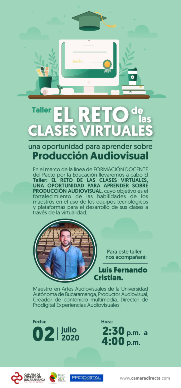El mundo cambia cada vez con mayor velocidad, debemos estar preparados para actuar rápidamente. El Pacto Por La Educación presenta un taller en donde usted tendrá la oportunidad de adquirir una serie de herramientas que le permitirán desarrollar clases virtuales con mayor profesionalismo, logrando fortalecer y enriquecer el proceso, brindando una mejor experiencia a los alumnos.
